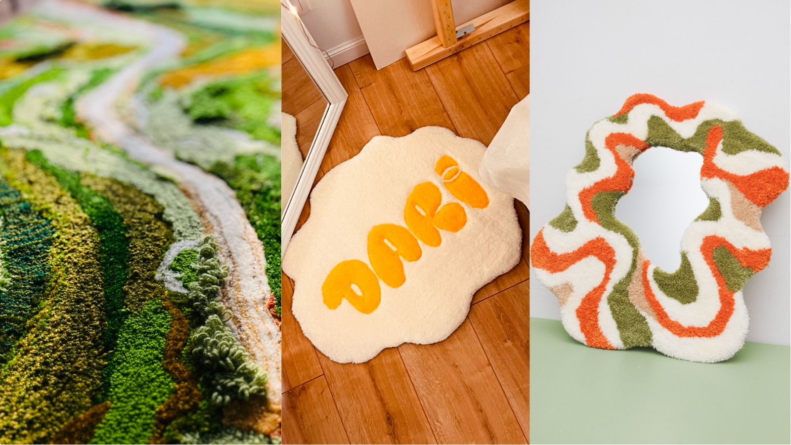 🪞 tuftingowe lustro dekoracyjne (45–55 cm) z obramowaniem z kolorowej, puszystej przędzy.